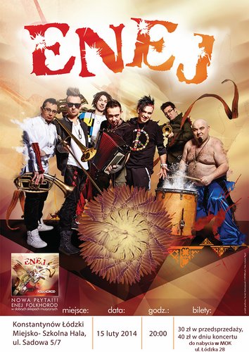 15 lutego w hali przy Szkole Podstawowej nr 5 w Konstantynowie Łódzkim o godz. 20.00 odbędzie się koncert zespołu Enej. Bilety w cenie 30 zł do nabycia w Miejskim Ośrodku Kultury w Konstantynowie Łódzkim.