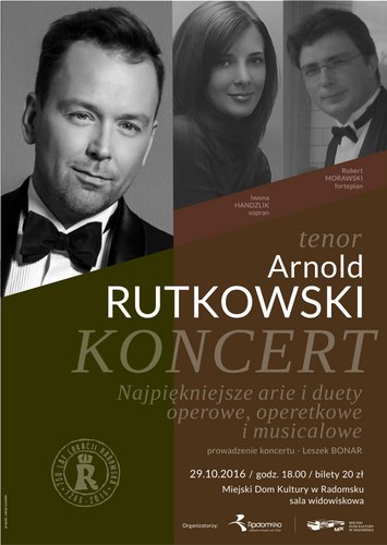 Miasto Radomsko i Miejski Dom Kultury w Radomsku 29 października 2016 o godz. 18.00 zapraszają na koncert tenora Arnolda Rutkowskiego. Artyście towarzyszyć będzie sopranistka Iwona Handzlik, a przy fortepianie Robert Morawski.