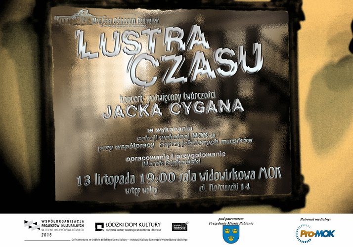 Najpiękniejsze teksty piosenek autorstwa poety Jacka Cygana usłyszymy 13 listopada w Miejskim Ośrodku Kultury w Pabianicach. Lustra czasu to tytuł spektaklu muzycznego, w którym zaprezentują się wokalistki sekcji wokalnej MOK-u oraz zaprzyjaźnieni pabianiccy muzycy. Na koncercie usłyszymy m.in. takie utwory, jak: Łatwopalni, Jestem kobietą, Laleczka z saskiej porcelany czy Dotyk. Gościem honorowym koncertu będzie Jacek Cygan.