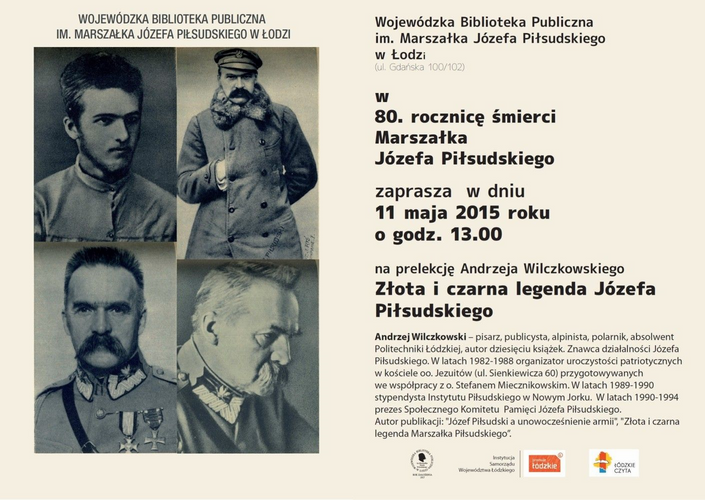Wojewódzka Biblioteka Publiczna im. Marszałka Józefa Piłsudskiego w Łodzi (ul. Gdańska 100/102) w 80. rocznicę śmierci Marszałka Józefa Piłsudskiego zaprasza w dniu 11 maja 2015 roku o godz. 13.00 na prelekcję Andrzeja Wilczkowskiego Złota i czarna legenda Józefa Piłsudskiego (sala konferencyjna, II p.).