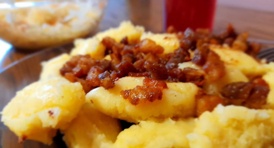 W czasie gotowania ziemniaków rozpuścić na patelni masło lub przesmażyć słoninę i dusić pokrojone w kosteczkę cebule.