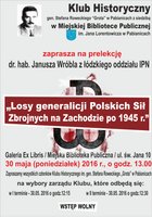 Miejska Biblioteka Publiczna im. Jana Lorentowicza w Pabianicach i Klub Historyczny im. gen. Stefana Roweckiego „Grota” w Pabianicach, zapraszają na prelekcję pt. „Losy generalicji Polskich Sił Zbrojnych na Zachodzie po 1945 r.”. Spotkanie odbędzie się 30 maja (poniedziałek) o godz. 13:00 w Galerii Ex Libris w Miejskiej Bibliotece Publicznej im. Jana Lorentowicza w Pabianicach.