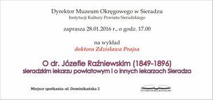 28 stycznia Muzeum w Sieradzu zaprasza na kolejny wykład w ramach Studium Regionalnego. Doktor Zdzisław Prajs opowie o dr. Józefie Raźniewskim (1849-1896), sieradzkim lekarzu powiatowym i o innych lekarzach z Sieradza. Spotkanie rozpocznie się o godzinie 17.00.