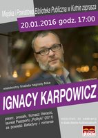 20 stycznia o godz. 17.00 w Miejskiej i Powiatowej Bibliotece Publicznej w Kutnie odbędzie się spotkanie autorskie z Ignacym Karpowiczem - wybitnym polskim pisarzem, prozaikiem i tłumaczem literackim. Jego ostatnia powieść zatytułowana "Sońka" zakwalifikowała się do finału Nagrody NIKE 2015.