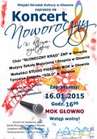 16 stycznia o godz. 16.00 w Miejskim Ośrodku Kultury w Głownie odbędzie się Koncert Noworoczny, podczas którego wystąpią: uczniowie Niepublicznej Szkoły Muzycznej I stopnia w Głownie, Zespół Śpiewaczy "Czeremcha", podopieczni Studia Piosenki MOK oraz zespół taneczny Gold.