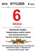 Partnerstwo na Rzecz Aleksandrowa Łódzkiego zaprasza w środę 6 stycznia 2016 o godz. 16.00 na wspólne kolędowanie. Spotkanie odbędzie się w sali Towarzystwa Śpiewaczego im St. Moniuszki w Aleksandrowie Łódzkim przy ul. Ogrodowej 10. Całość poprowadzą młode artystki Karolina Dróżdż i Anna Pietrzak, które będą akompaniowały śpiewającym.