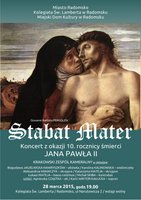 Miasto Radomsko, Kolegiata Św. Lamberta oraz Miejski Dom Kultury w Radomsku zapraszają na koncert Stabat Mater w 10. rocznicę śmierci Jana Pawła II. Kompozycję religijną Giovanniego Battisty Pergolesiego wykona 28 marca Krakowski Zespół Kameralny. Wydarzenie rozpocznie się o godz. 19.00.