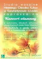 Studio wokalne Miejskiego Ośrodka Kultury w Konstantynowie Łódzkim zaprasza 28 marca o godz. 18.00 na Koncert wiosenny w wykonaniu młodych artystów przygotowanych przez Annę Werecką. Wstęp wolny!