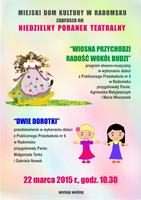 22 marca w Miejskim Domu Kultury w Radomsku odbędzie się kolejny Niedzielny Poranek Teatralny w ramach którego przedszkolaki zaprezentują program słowno-muzyczny Wiosna przychodzi radość wokół budzi i spektakl Dwie Dorotki . Wstęp wolny!