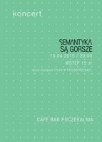 10 kwietnia o godz. 20.00 w Cafe Bar Poczekalnia w Łodzi wystąpi zespół Semantyka , który łączy w swojej muzyce łączy elementy rocka, poezji śpiewanej oraz elektroniki i Są Gorsze , tworzący nowy gatunek muzyki improwizowanej. Ilość wejściówek ograniczona! Bilety w cenie 15 zł do nabycia tylko w przedsprzedaży.
