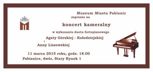 Muzeum Miasta Pabianic zaprasza 11 marca o godz. 18.00 na koncert kameralny w wykonaniu duetu fortepianowego: Agaty Górskiej-Kołodziejskiej i Anny Liszewskiej.