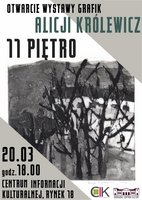 20 marca o godz. 18.00 w Centrum Informacji Kulturalnej w Sieradzu odbędzie się otwarcie wystawy "11 piętro" Alicji Królewicz. Na wystawie zobaczymy grafiki wykonane w technikach akwaforty, akwatinty i suchej igły. Są to małe wycinki rozległego miejskiego krajobrazu obserwowanego z 10 i 11 piętra łódzkich wieżowców, które stanowią próbę zatrzymania pewnej specyficznej atmosfery...