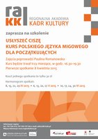 W ramach Regionalnej Akademii Kadr Kultury w kwietniu rozpoczynamy Kurs polskiego języka migowego dla początkujących , który będzie kontynuowany przez trzy miesiące. Pierwsze spotkanie odbędzie się 8 kwietnia br. w Łódzkim Domu Kultury w sali 101, godz. 16.30.