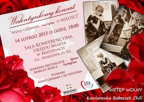 14 lutego o godz. 18.00 w Urzędzie Miasta w Brzezinach odbędzie koncert walentynkowy Anna German nie tylko o miłości. Przeboje wybitnej polskiej artystki wykona Marzena Michalczyk przy akompaniamencie Marcina Kurcza. Wstęp wolny!