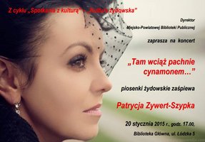 Miejsko-Powiatowa Biblioteka Publiczna w Zgierzu zaprasza 20 stycznia o godz. 17.00 na koncert Tam wciąż pachnie cynamonem... z cyklu Spotkania z kulturą - kultura żydowska . Piosenki żydowskie zaśpiewa Patrycja Zywert-Szypka.