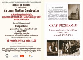 28 stycznia o godz. 13.00 w Wojewódzkiej Bibliotece Publicznej im. Marszałka Józefa Piłsudskiego w Łodzi odbędzie się spotkanie z profesorem Marianem Markiem Drozdowskim połączone z promocją książki Czas przełomu. Społeczeństwo i życie religijne Miasta Łodzi w latach 1918-1921. Antologia źródeł i materiałów. Wstęp wolny!