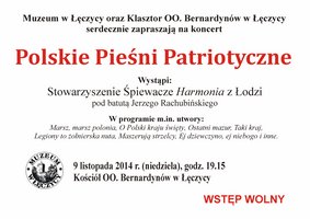 Muzeum w Łęczycy serdecznie zaprasza 9 listopada o godz. 19.15 na koncert pieśni patriotycznych, który odbędzie się w kościele OO. Bernardynów w Łęczycy. Wstęp wolny!