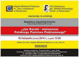 Miejska Biblioteka Publiczna im. Jana Lorentowicza w Pabianicach zaprasza 19 listopada o godz. 13.00 na prelekcję Klubu Historycznego działającego przy Bibliotece pt.: Jan Karski - emisariusz Polskiego Państwa Podziemnego .