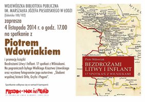 Wojewódzka Biblioteka Publiczna im. Marszałka Józefa Piłsudskiego w Łodzi zaprasza 4 listopada o godz. 17.00 na spotkanie z Piotrem Wdowiakiem i promocję książki „Bezdrożami Litwy i Inflant. 17 spotkań z Wilniukami. Na pograniczach byłego Wielkiego Księstwa Litewskiego”. Spotkaniu towarzyszyć będzie wystawa fotogramów autora „Śladami wspólnej historii Orła, Gryfa i Pogoni – wczoraj i dziś”.