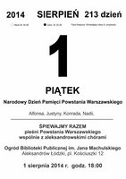 1 sierpnia o godz. 18.00 w Ogrodzie Biblioteki, Aleksandrów Łódzki, pl. Kościuszki 12 - "Piosenki Powstania Warszawskiego" z cyklu "Śpiewajmy razem".