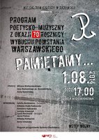 1 sierpnia przypada 70. rocznica wybuchu Powstania Warszawskiego. Z tej okazji na scenie MDK w Radomsku w sali widowiskowej o godz. 17.00 zaprezentowany zostanie program poetycko-muzyczny "Pamiętamy...".