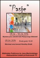 9 kwietnia o godz. 18.00 Partnerstwo na Rzecz Aleksandrowa Łódzkiego zaprasza do Czytelni Biblioteki w Aleksandrowie Łódzkim na wystawę dokonań artystycznych uczestniczek zajęć Koła Plastycznego Biblioteki pt "Pasje" .Wernisaż uświetni koncert Karoliny Dróżdż. Wystawę będzie można oglądac do końca kwietnia.