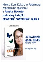 W ramach Światowego Dnia Książki 23 kwietnia o godz. 18.00 w Miejskim Domu Kultury w Radomsku, odbędzie się spotkanie z Anetą Borutą - autorką książki "Oswoić swojego raka". Jest to autobiograficzna opowieść o zmaganiach młodej kobiety z chorobą nowotworową. Autorka dzieli się swoimi wspomnieniami i przemyśleniami, aby dać nadzieję i siłę osobom chorym.