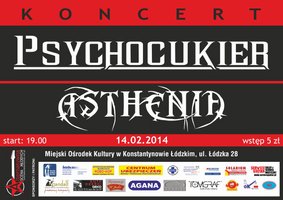 Alternatywna Scena Młodych zaprasza 14 lutego o godz. 19.00 na koncert zespołu Psychocukier i Asthenia, który odbędzie się w Miejskim Ośrodku Kultury w Konstantynowie Łódzkim. Wstęp: 5 zł.