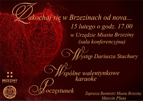 Burmistrz Miasta Brzeziny zaprasza na spotkanie walentynkowe - "Zakochaj się w Brzezinach od nova" - które odbędzie się 15 lutego w sali konferencyjnej Urzędu Miasta Brzeziny. Zapraszamy.