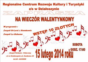 Regionalne Centrum Rozwoju Kultury i Turystyki z/s w Działoszynie zaprasza na Wieczór Walentynkowy, który odbędzie się 15 lutego 2014 r. o godz. 17:00. Bilety w cenie 10 zł.
