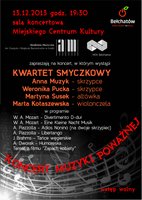 13 grudnia o godzinie 19.30 w sali koncertowej Miejskiego Centrum Kultury w Bełchatowie, odbędzie się koncert Kwartetu Akademii Muzycznej im. Grażyny i Kiejstuta Bacewiczów w składzie: Anna Muzyk, Weronika Pucka, Martyna Susek i Marta Kotaszewska. Wstęp wolny!