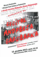 Miasto Radomsko i Miejski Dom Kultury w Radomsku z okazji rocznicy Wybuchu Stanu Wojennego zapraszają 13 grudnia o godz. 19.15 na recital Andrzeja Garczarka. Artyście towarzyszyć będzie akompaniament Floriana Ciborowskiego i Mirosława Kozaka. Sala kameralna - wstęp wolny!