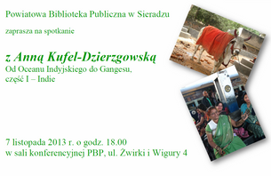 Powiatowa Biblioteka Publiczna w Sieradzu zaprasza 7 listopada o godz. 18.00 na pierwsze spotkanie z Anną Kufel-Dzierzgowską z cyklu "Od Oceanu Indyjskiego do Gangesu"., które będzie poświęcone Indiom.