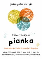 9 listopada o godz. 18.00 w Herbaciarni Klimaty w Aleksandrowie Łódzkim odbędzie się kolejny koncert z cyklu Jesień pełna muzyki . Tym razem wystąpi zespół "Pianka" w składzie: Joanna Kotowska, Kalina Kieszniewska i Daria Płusa.