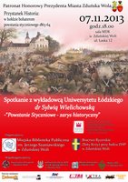 Miejska Biblioteka Publiczna im. Jerzego Szaniawskiego w Zduńskiej Woli i Grupa Rekonstrukcji Historycznych "Złoty Krzyż" zapraszają na spotkanie zatytułowane "Powstanie styczniowe - zarys historyczny" z wykładowcą Uniwersytetu Łódzkiego dr Sylwią Wielichowską. Spotkanie odbędzie się w sali wystawienniczej Miejskiego Domu Kultury 7 listopada 2013 r. o godz. 18.00.