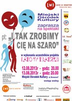 Miejski Ośrodek Kultury w Tomaszowie Mazowieckim zaprasza na spektakl pt. "I tak zrobimy cię na szaro" w wykonaniu uczestników projektu "Lato w teatrze". Spektakl zostanie zaprezentowany 12 i 13 sierpnia o godz. 20.00 w Miejskim Ośrodku Kultury. Wstęp wolny! Spektakl jest efektem warsztatów aktorskich, scenograficzno-kostiumowych, muzycznych oraz dziennikarskich.