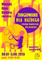 MDK Radomsko zaprasza młodzież do udziału w warsztatach kuglarskich. Warsztaty odbywać się będą w dniach 30 lipca - 3 sierpnia, w godz. 17.00-19.00 Zapisy prowadzi Dział Upowszechniania Filmu i Organizacji Imprez MDK Radomsko. Opłata wynosi 10 zł/os
