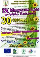 30 czerwca o godz. 14.00 już po raz 9 będziemy mieli okazję bawić się na festynie - MUZYCZNE LATO w WOLI RAKOWEJ. Na plenerowej scenie zaprezentują się m.in: Artyści Teatru Wielkiego z Łodzi, Orkiestra OSP z Kurowic, Zespół Mażoretki „SIETE”, amatorskie zespoły Śpiewacze i grupy taneczne. Gwiazdą wieczoru będzie Don Vasyl i Gwiazdy Cygańskiej Pieśni.