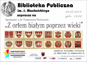 Biblioteka Publiczna im. Jana Machulskiego w Aleksandrowie Łódzkim 24 maja o godz. 18.00 zaprasza wszystkich zaintersowanych dziejami polskiej symboliki państwowej na spotkanie z dr Tomaszem Pietrasem, pracownikiem aukowym Uniwersytetu Łódzkiego i członkiem Towarzystwa Przyjaciół Aleksandrowa Łódzkiego.