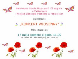Państwowa Szkoła Muzyczna I i II stopnia i Miejska Biblioteka Publiczna w Pabianicach zapraszają na ''Koncert Wiosenny'' w wykonaniu uczniów szkoły. Koncert odbędzie się 17 maja o godz. 11.00 w Galerii Ex Libris. Wstęp wolny! Serdecznie zapraszamy.