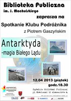 Partnerstwo Na Rzecz Aleksandrowa Łódzkiego zaprasza 12 kwietnia o godz. 18.30 na spotkanie Klubu Podróżnika z Piotrem Gaszyńskim "Antarktyda - magia Białego Lądu" w Czytelni Biblioteki Publicznej im. Jana Machulskiego w Aleksandrowie Łódzkim.