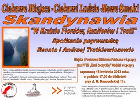 W ramach projektu „Ciekawe miejsca – Ciekawi ludzie – Nowe smaki” czyli cykl spotkań z podróżnikami Miejska i Powiatowa Biblioteka Publiczna w Łęczycy zaprasza na spotkanie "W krainie fiordów, reniferów i trolli", na którym Renata i Andrzej Tratkiewiczowie, zabiorą słuchaczy do najciekawszych miejsc Skandynawii. Spotkanie odbędzie się 18 kwietnia 2013 r. o godzinie 17.00.