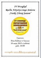 Dom Kultury w Łęczycy już po raz czwarty jest organizatorem Przeglądu Artystycznego Ruchu Seniora pod nazwą „Nutki Złotej Jesieni”. Zapraszamy do udziału zespoły wokalne, wokalno-instrumentalne, Kluby Seniora, kapele ludowe i podwórkowe, kabarety, solistów i gawędziarzy. W tym roku konkurs odbędzie się 18 maja br., po raz pierwszy w plenerze. Na zgłoszenia czekamy do 9 maja.