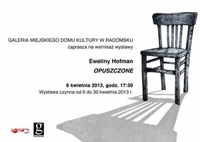 W Miejskim Domu Kultury w Radomsku 6 kwietnia o godz. 17.30 odbędzie się wernisaż wystawy "Opuszczone" Eweliny Hofman - Absolwentki Wydziału Wychowania Artystycznego Akademii im. Jana Długosza w Częstochowie zajmującej się grafiką, rysunkiem i malarstwem.