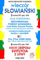 5 kwietnia Miejski Dom Kultury zaprasza na Wieczór słowiański. W programie Klub Podróżnika czyli "Sentymentalna podróż słowiańska", której towarzyszyć będą wystawy tradycyjnych strojów i pamiątek, dyskusje i degustacje potraw regionalnych. Po Sentymentalnej podróży słowiańskiej odbędzie się projekcja filmu "Żyła sobie baba". A 6 kwietnia zapraszamy na koncert zespołu folklorystycznego "Svitlycia" z Litwy.