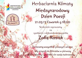 Serdecznie zapraszamy na spotkanie z aleksandrowską poetką Zofią Rosiak. Zachęcamy też wszystkich piszących wiersze aby przyszli do Herbaciarni Klimaty w Aleksandrowie Łódzkim w pierwszy Dzień Wiosny 21 marca o godz. 18.00 i pochwalili się swoją twórczością.