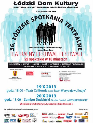 Od 2 września do 9 grudnia 2013 r. w ramach 36. Łódzkich Spotkań Teatralnych w 10 miastach województwa łódzkiego zostaną zaprezentowane 22 spektakle teatralne. W dniach 19 - 20 października festiwal zawita do Wieluńskiego Domu Kultury, gdzie będzie można obejrzeć 2 spektakle: Iwan Wyrypajew „Iluzje” Teatru California oraz „Dźwiękowiązałka” Sambora Dudzińskiego. Wstęp wolny!