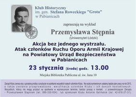 Zapraszamy miłośników historii na wykład Przemysława Stępnia z Uniwersytetu Łódzkiego pt.: "Akcja bez jednego wystrzału. Atak członków Ruchu Oporu Armii Krajowej na Powiatowy Urząd bezpieczeństwa w Pabianicach". Spotkanie odbędzie się 23 stycznia o godz. 13.00 w Miejskiej Bibliotece Publicznej w Pabianicach.