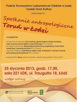 Polskie Towarzystwo Ludoznawcze o/Łódź oraz Łódzki Dom Kultury zapraszają na spotkanie antropologiczne Toruń w Łodzi. 25 stycznia, godzina 17.00, sala 221 ŁDK. Wstęp wolny.