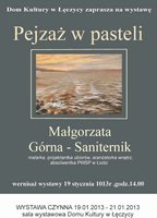 Dom Kultury w Łęczycy zaprasza 19 stycznia 2013 o godzinie 14.00 na wernisaż wystawy malarskiej 'PEJZAŻ W PASTELI" Małgorzaty Górnej-Saniternik, absolwentki PWSP w Łodzi zajmującej się malarstwem, kolażem, tkaniną unikatową, ubiorem a nawet aranżacją wnętrz.